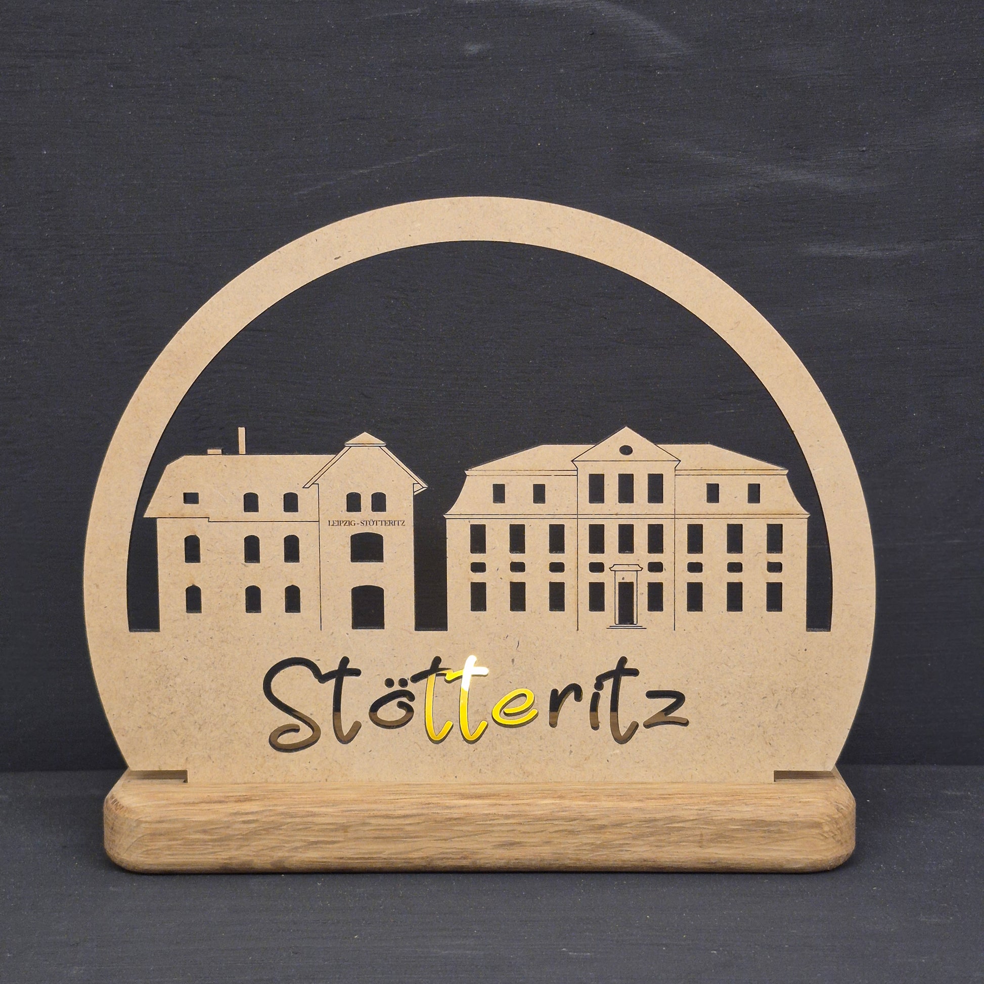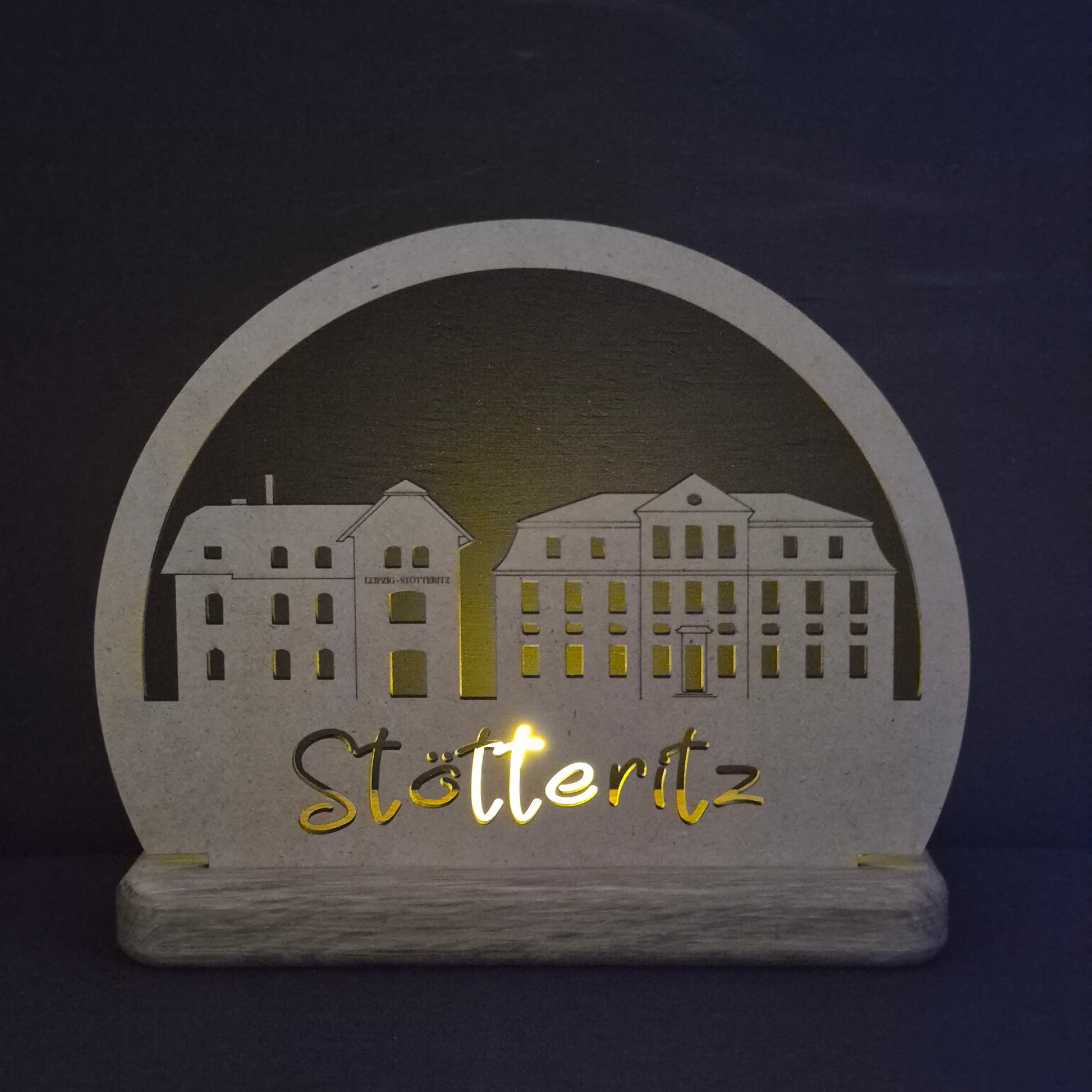 Dieser wunderschöne Bogen zeigt die charakteristische Silhouette des Herrenhauses sowie des alten Bahnhofgebäudes in Stötteritz. Er ist das perfekte Dekorationselement, um Deine Verbundenheit mit Stötteritz auszudrücken oder einem lieben Menschen ein einzigartiges Andenken zu schenken.