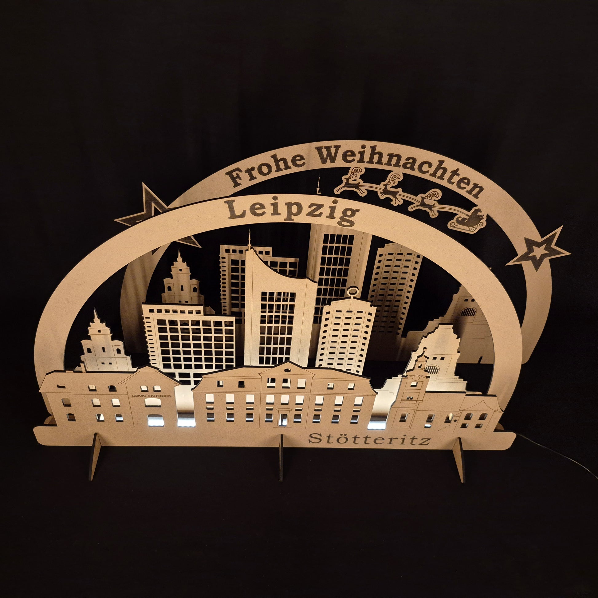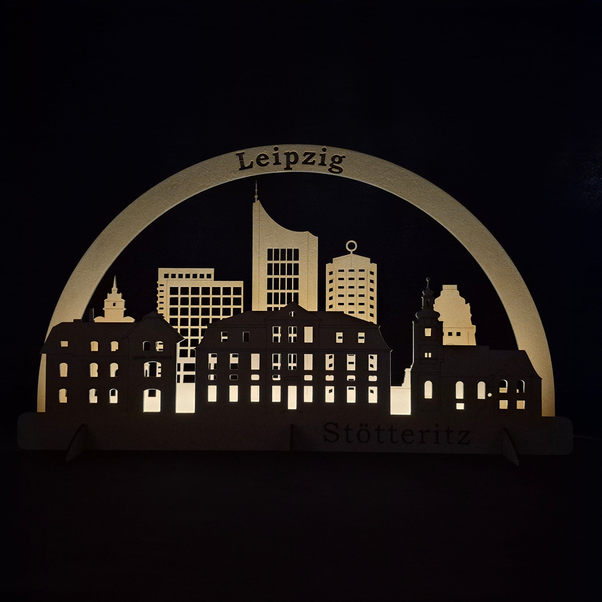 Der Lichtbogen Stötteritz ist mehr als nur Dekoration – er ist ein Stück Heimat für Dein Zuhause. Mit seinen liebevoll gestalteten Motiven bringt er die besonderen Orte Deines Stadtteils zum Strahlen und schafft eine warme, gemütliche Atmosphäre, die zum Verweilen einlädt.