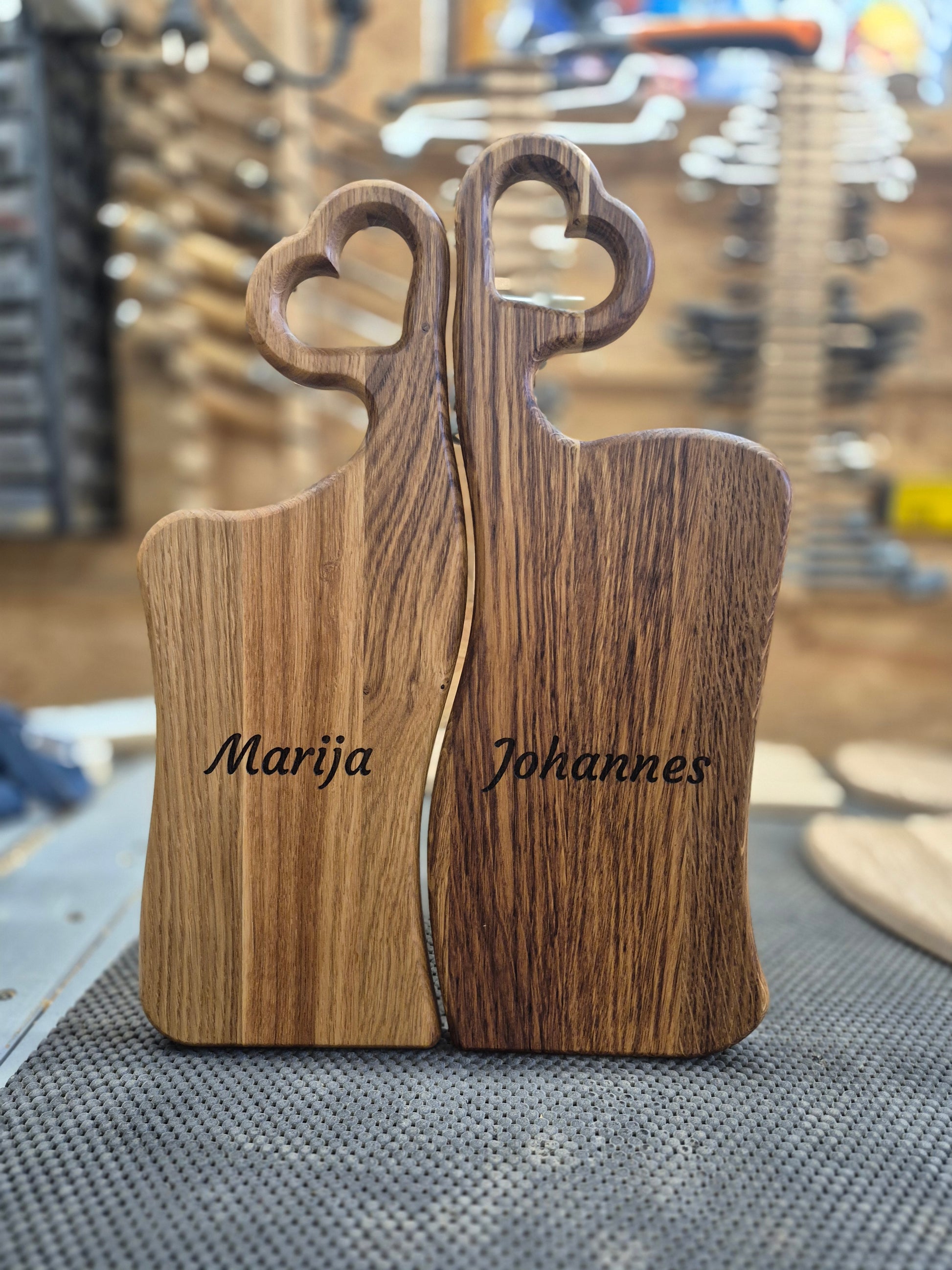 Genieße Deine herzhaften Speisen auf unseren exquisiten Paarbrettchen, die speziell für Liebhaber handwerklicher Qualität und rustikaler Eleganz entworfen wurden. Diese einzigartigen Brettchen werden aus massivem Eichenholz oder Nussbaum gefertigt und überzeugen durch ihre robuste und langlebige Beschaffenheit.